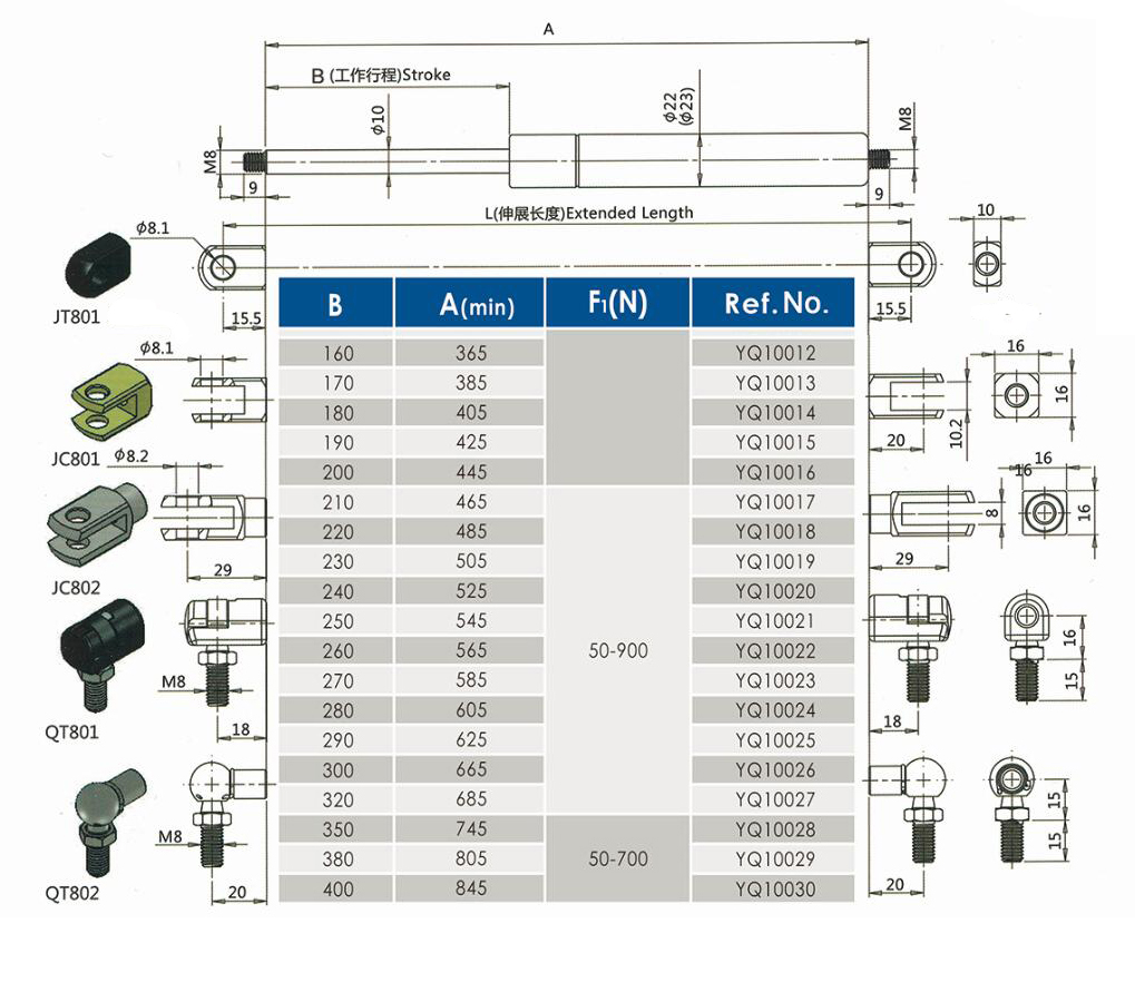 注:由于氣彈簧是非標準的,以上僅為型號的一部分。我們可以根據客戶的要求定制。