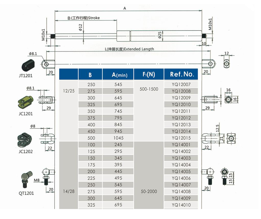 注:由于氣彈簧是非標準的,以上僅為型號的一部分。我們可以根據客戶的要求定制。